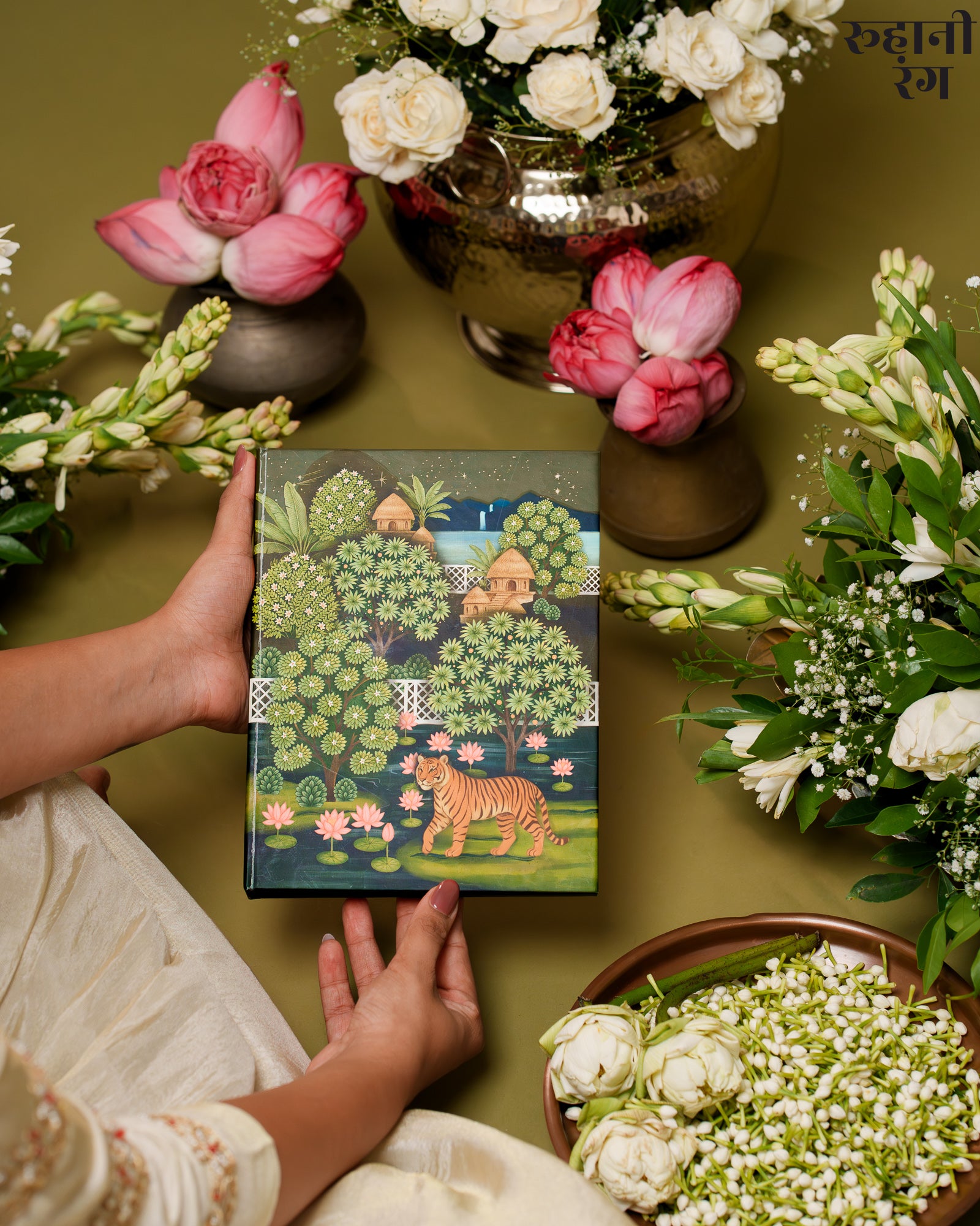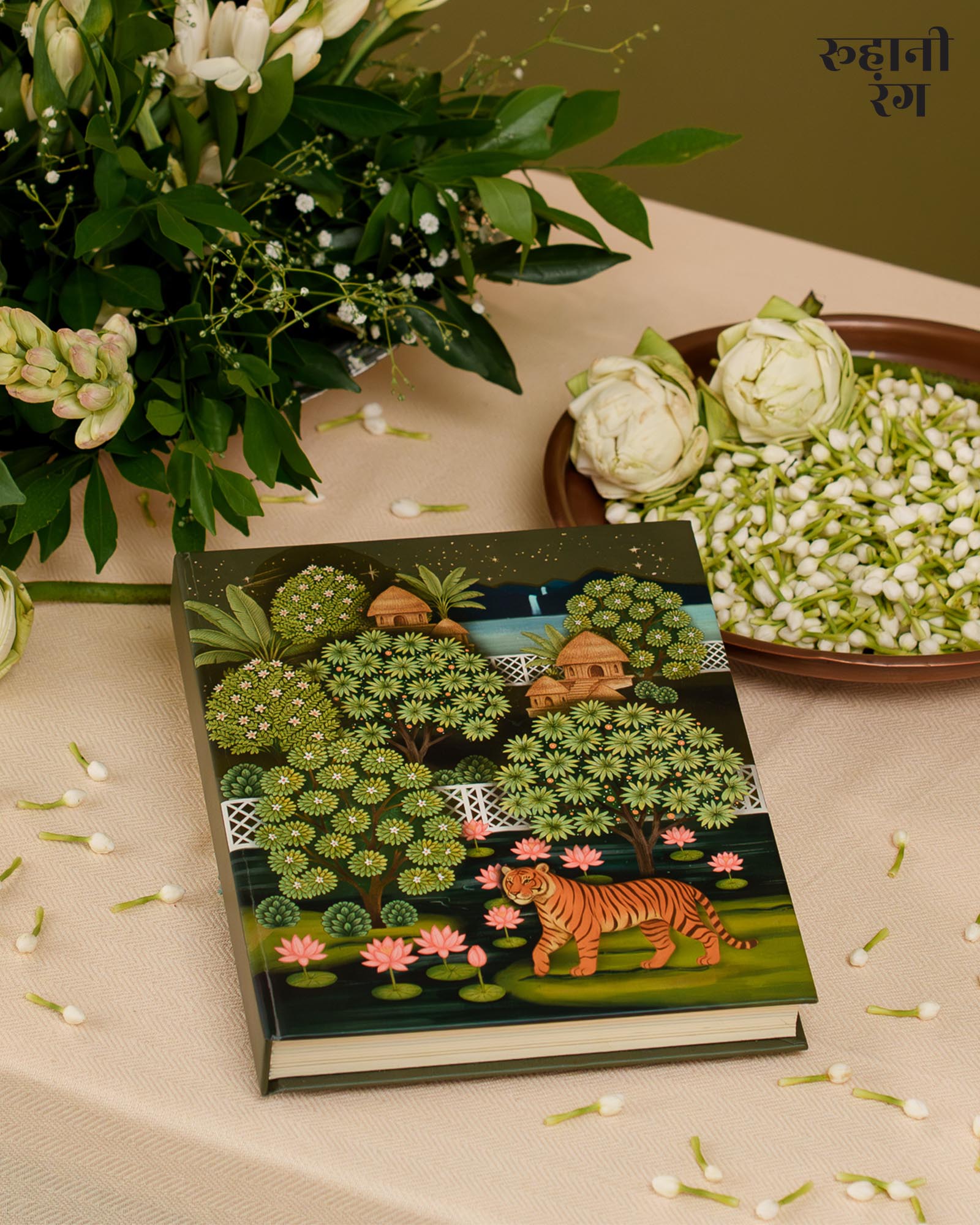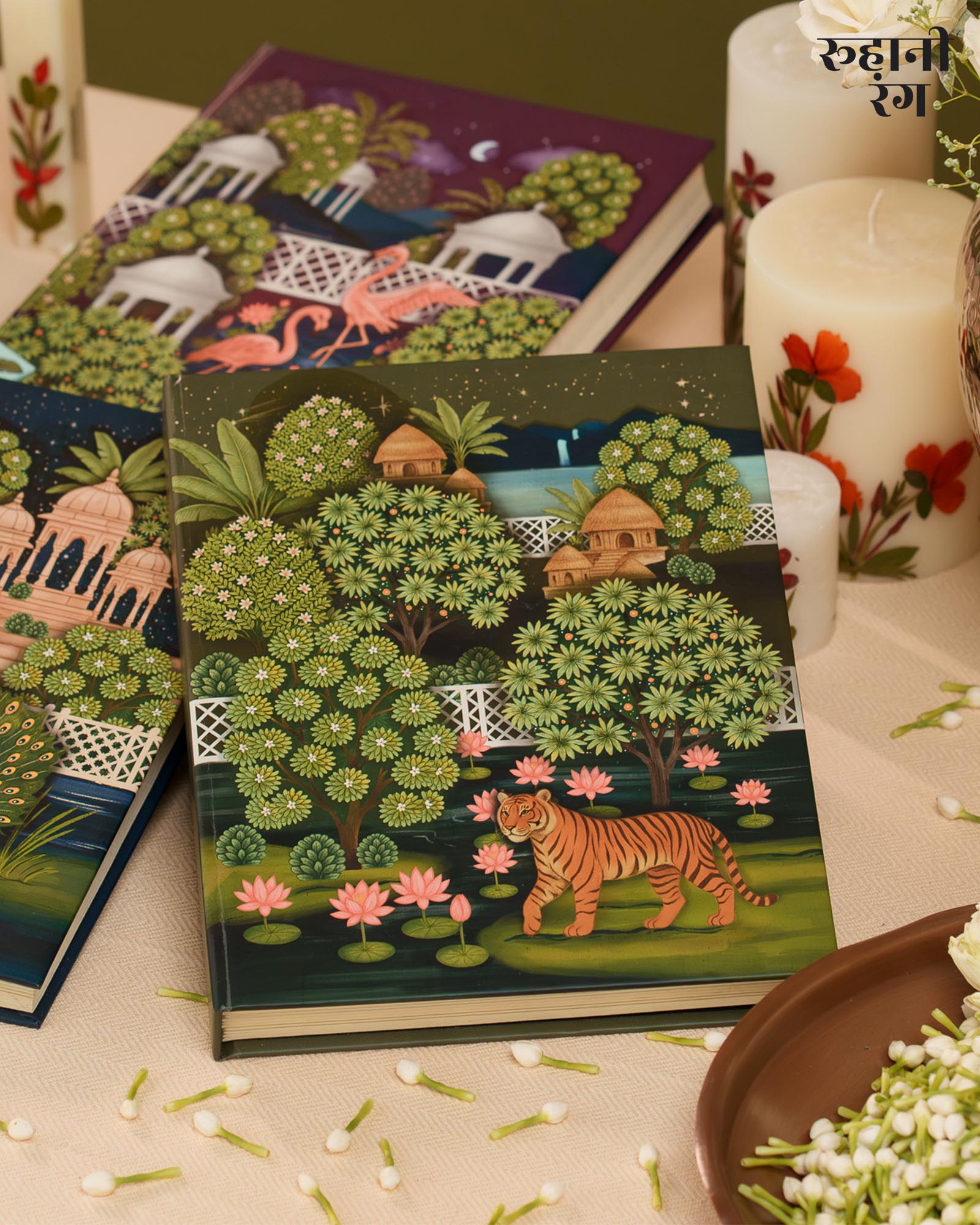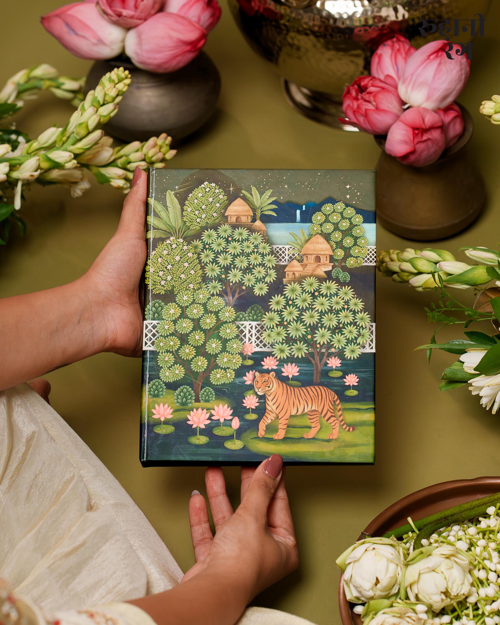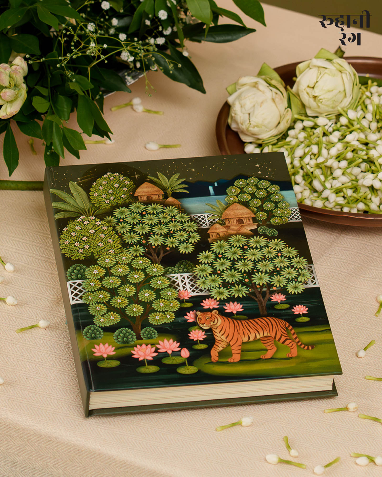 The cover art, The design feels both lush and peaceful — like the quiet calm of early mornings when mist still clings to the trees, and the world hasn’t yet begun to rush. Every detail, from the flowing foliage to the perched parrots, carries the soft storytelling touch that defines Roohanirang. Hand-illustrated to honor India’s heritage of miniature paintings.