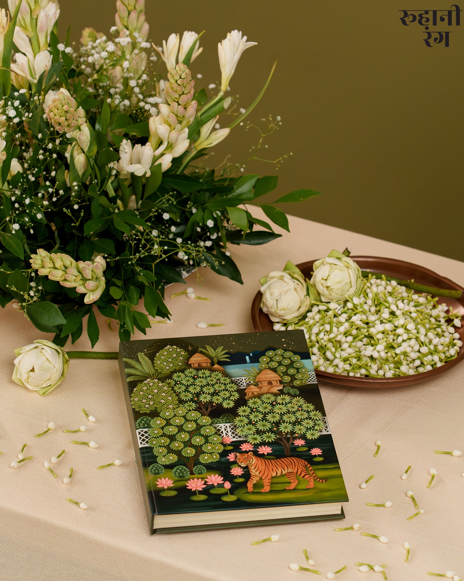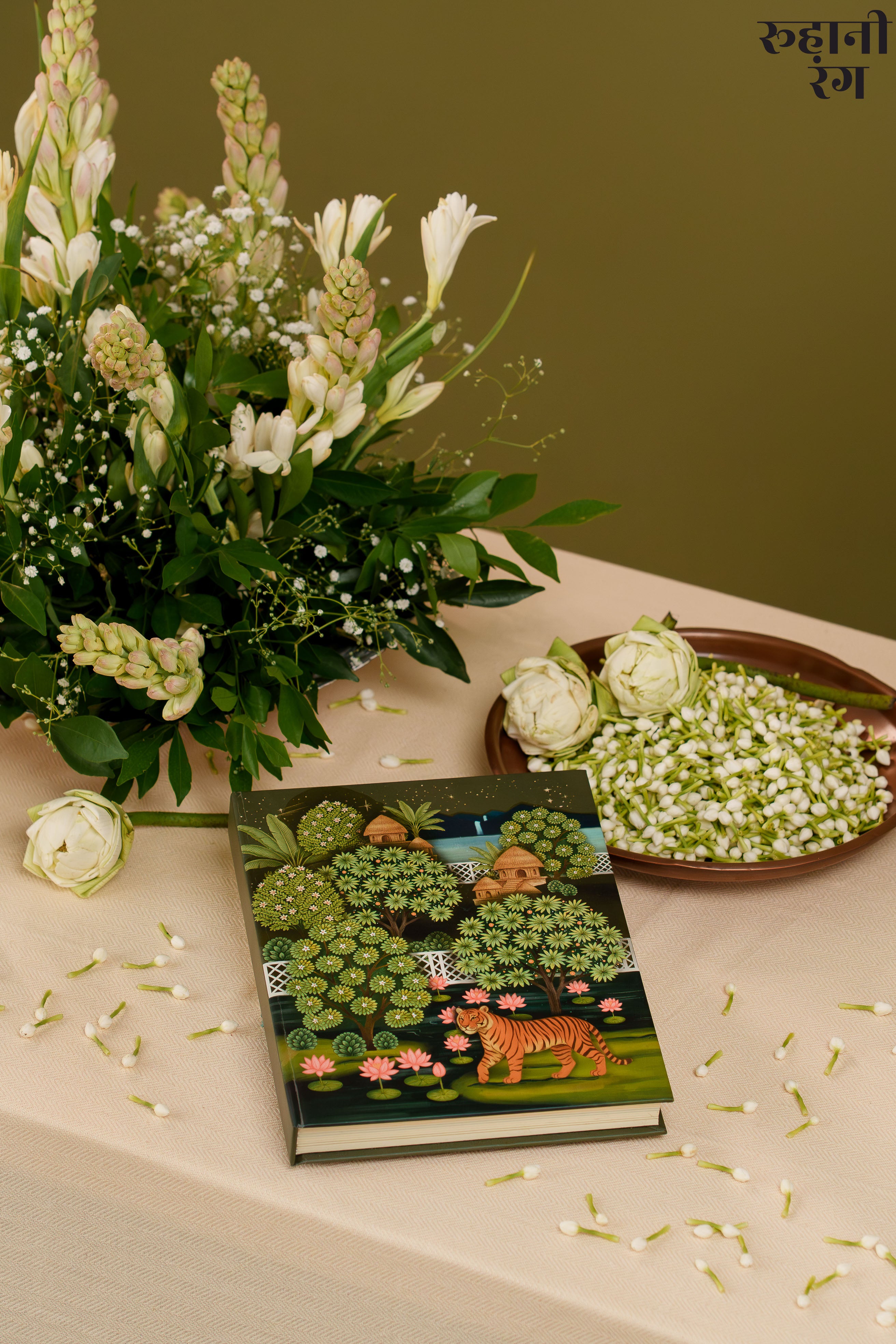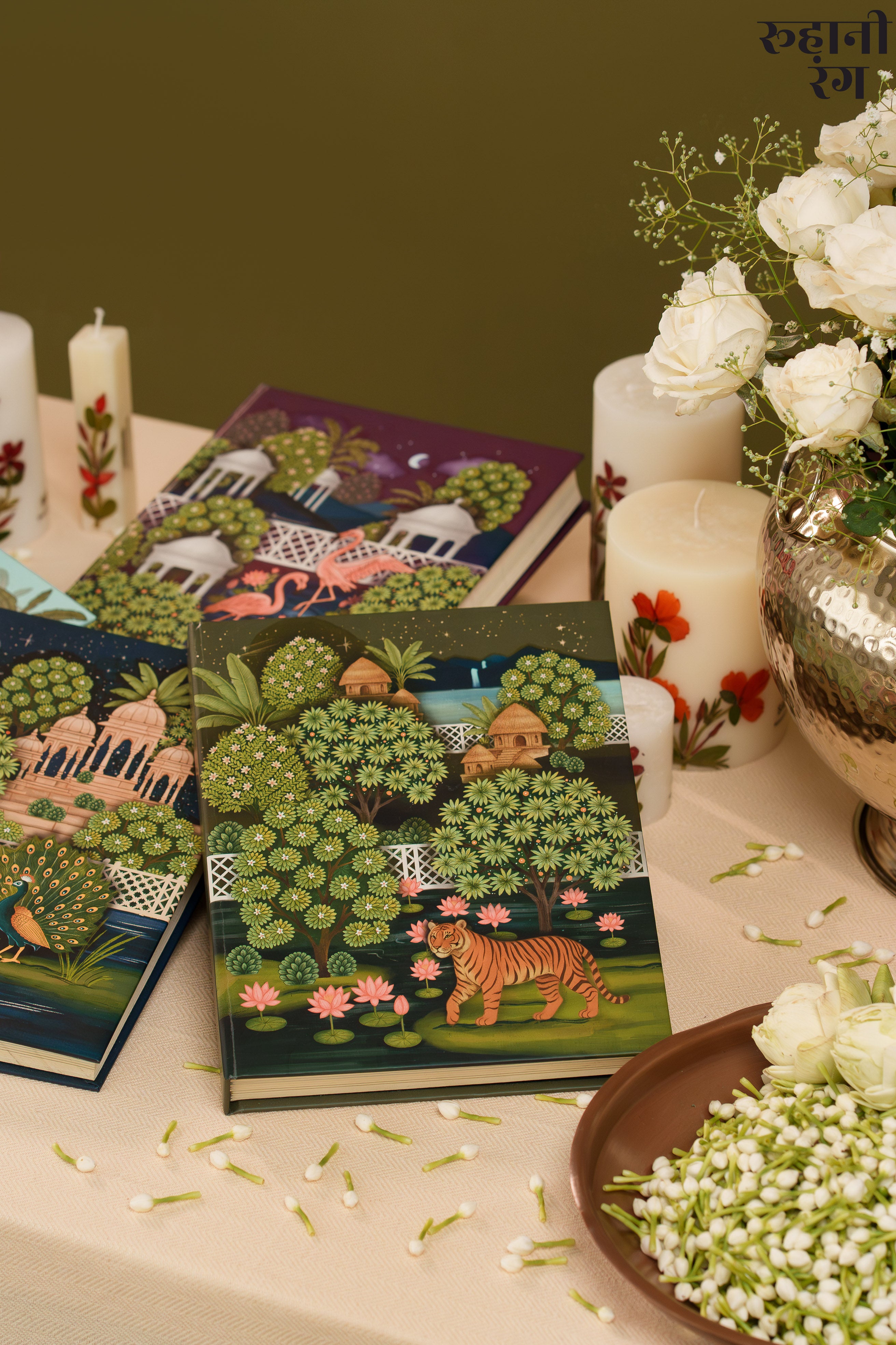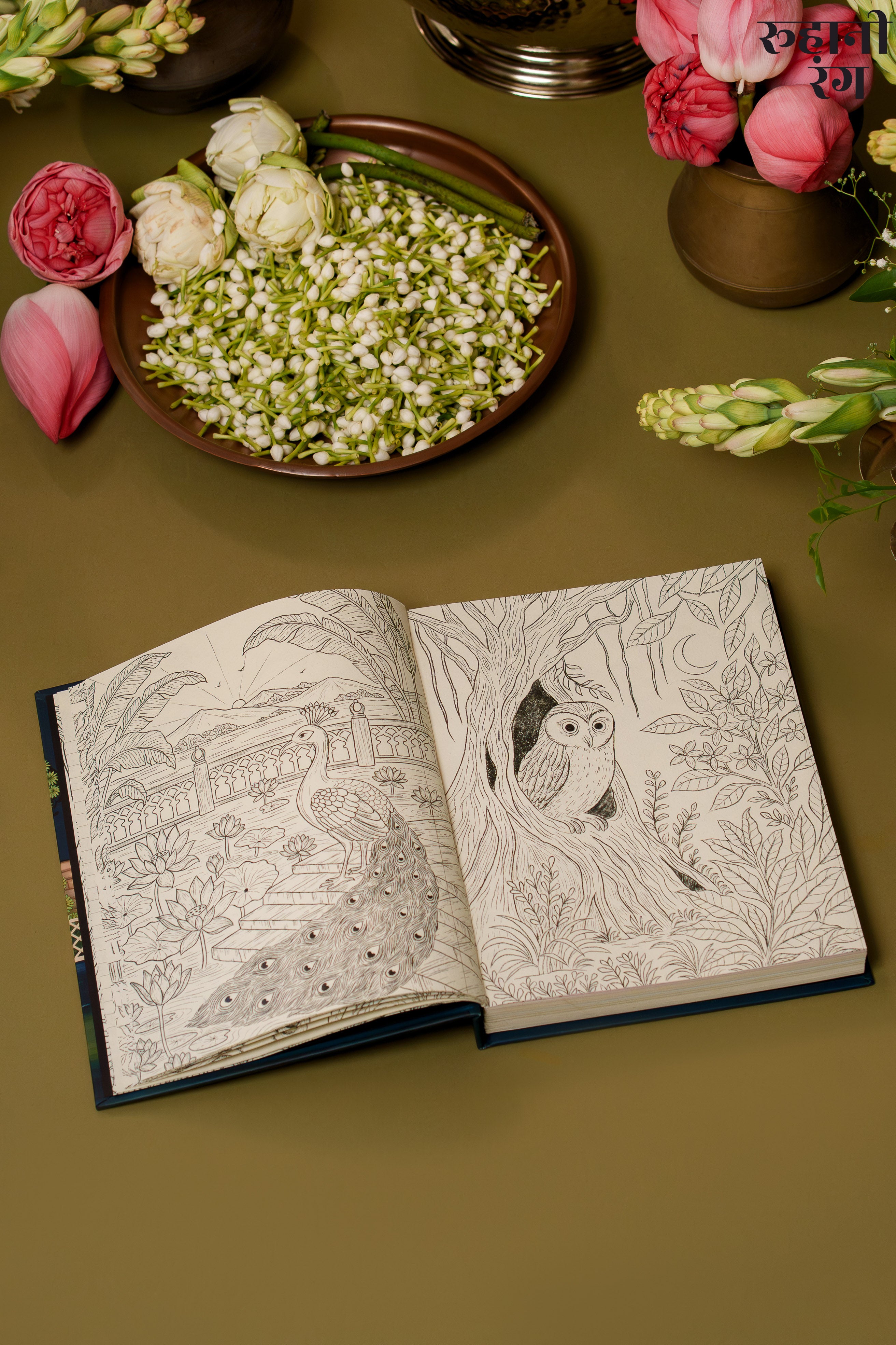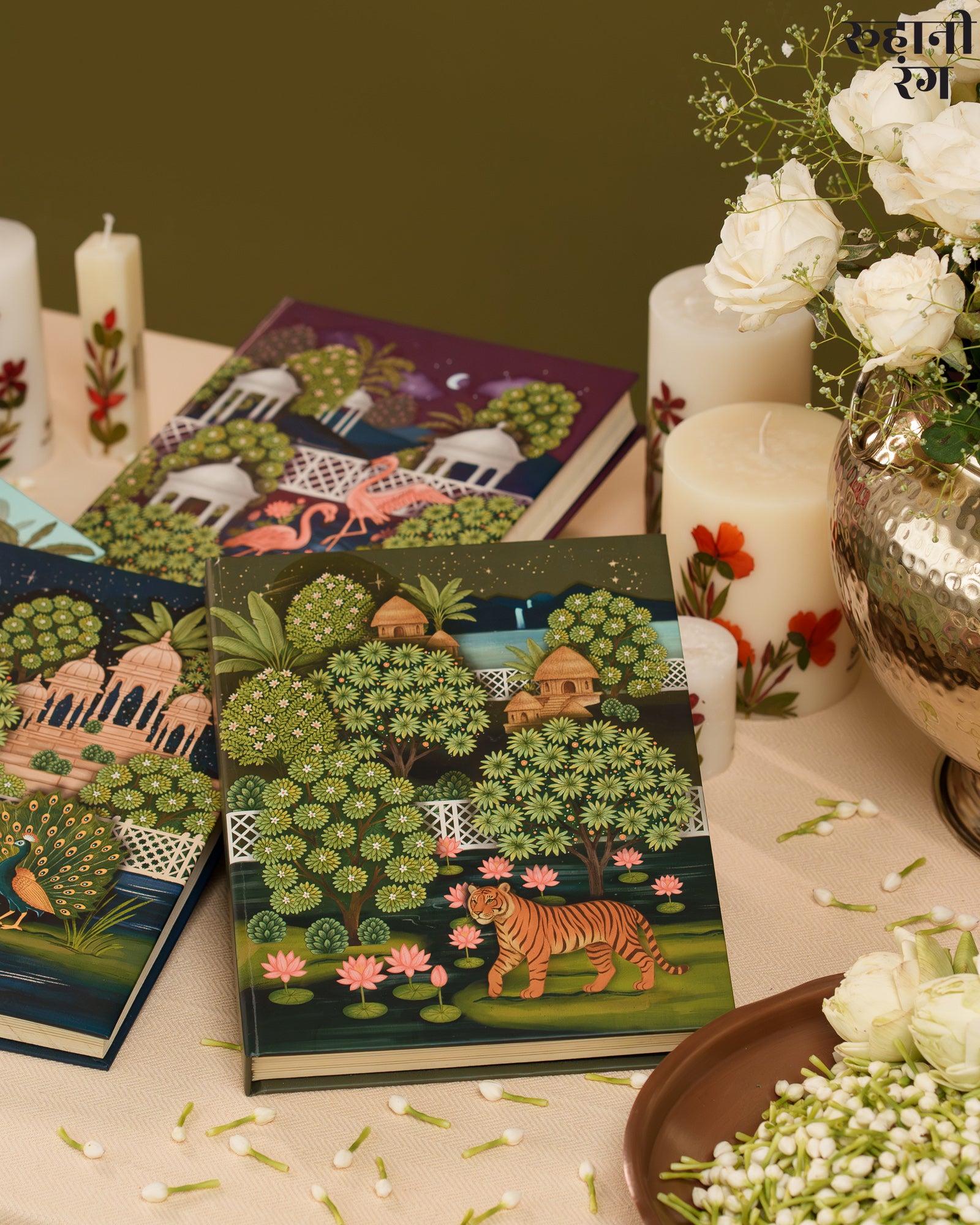 The cover art, The design feels both lush and peaceful — like the quiet calm of early mornings when mist still clings to the trees, and the world hasn’t yet begun to rush. Every detail, from the flowing foliage to the perched parrots, carries the soft storytelling touch that defines Roohanirang. Hand-illustrated to honor India’s heritage of miniature paintings.