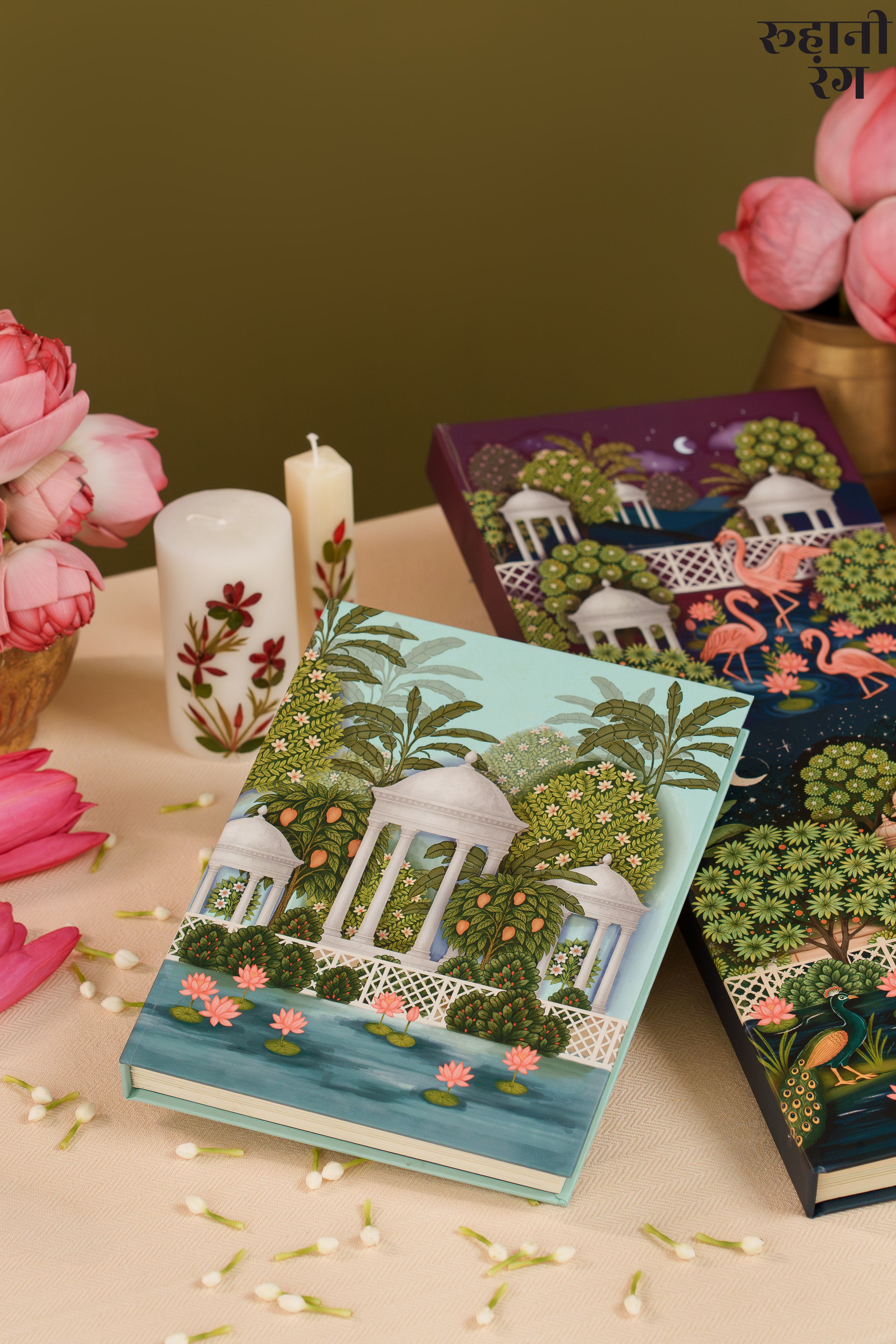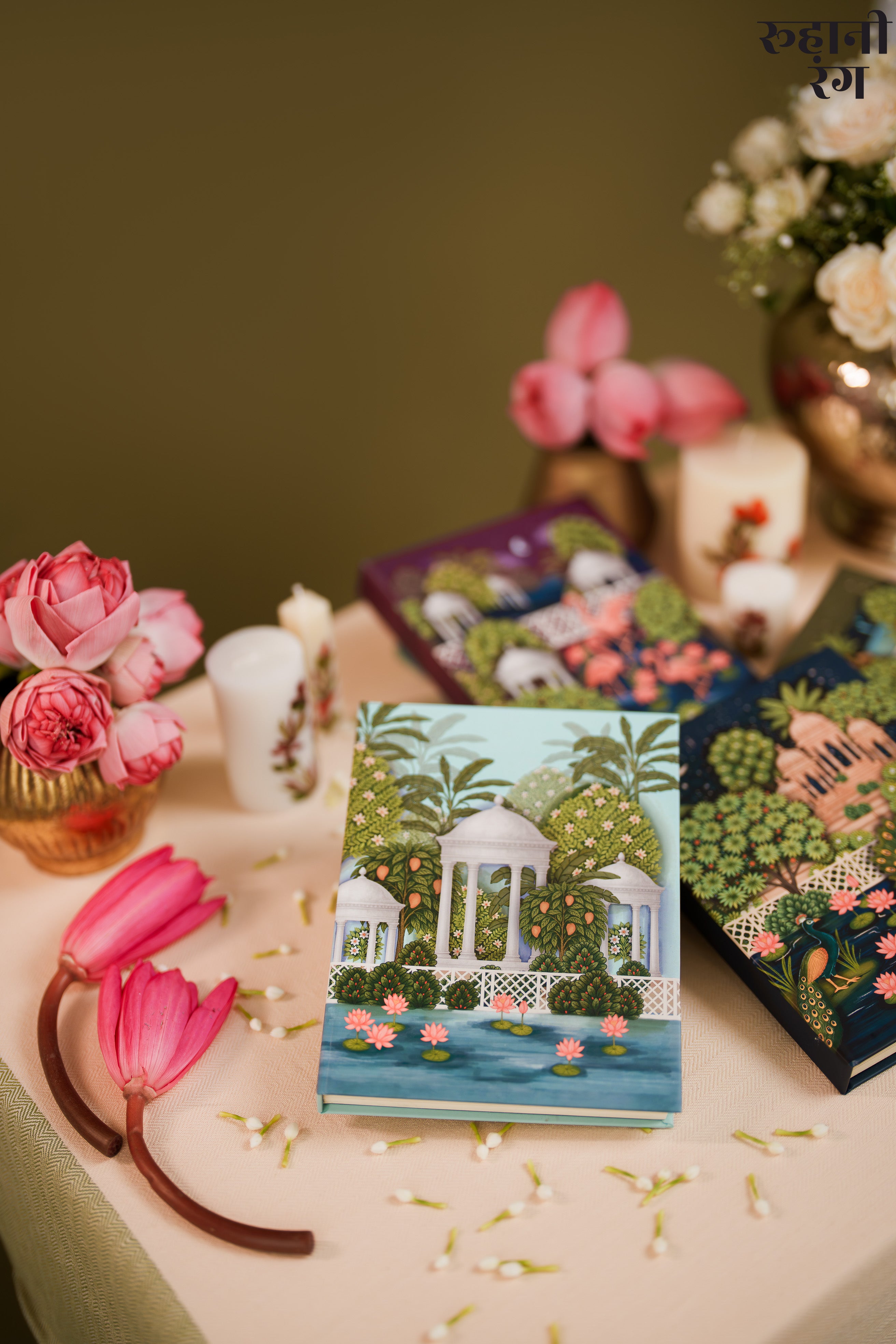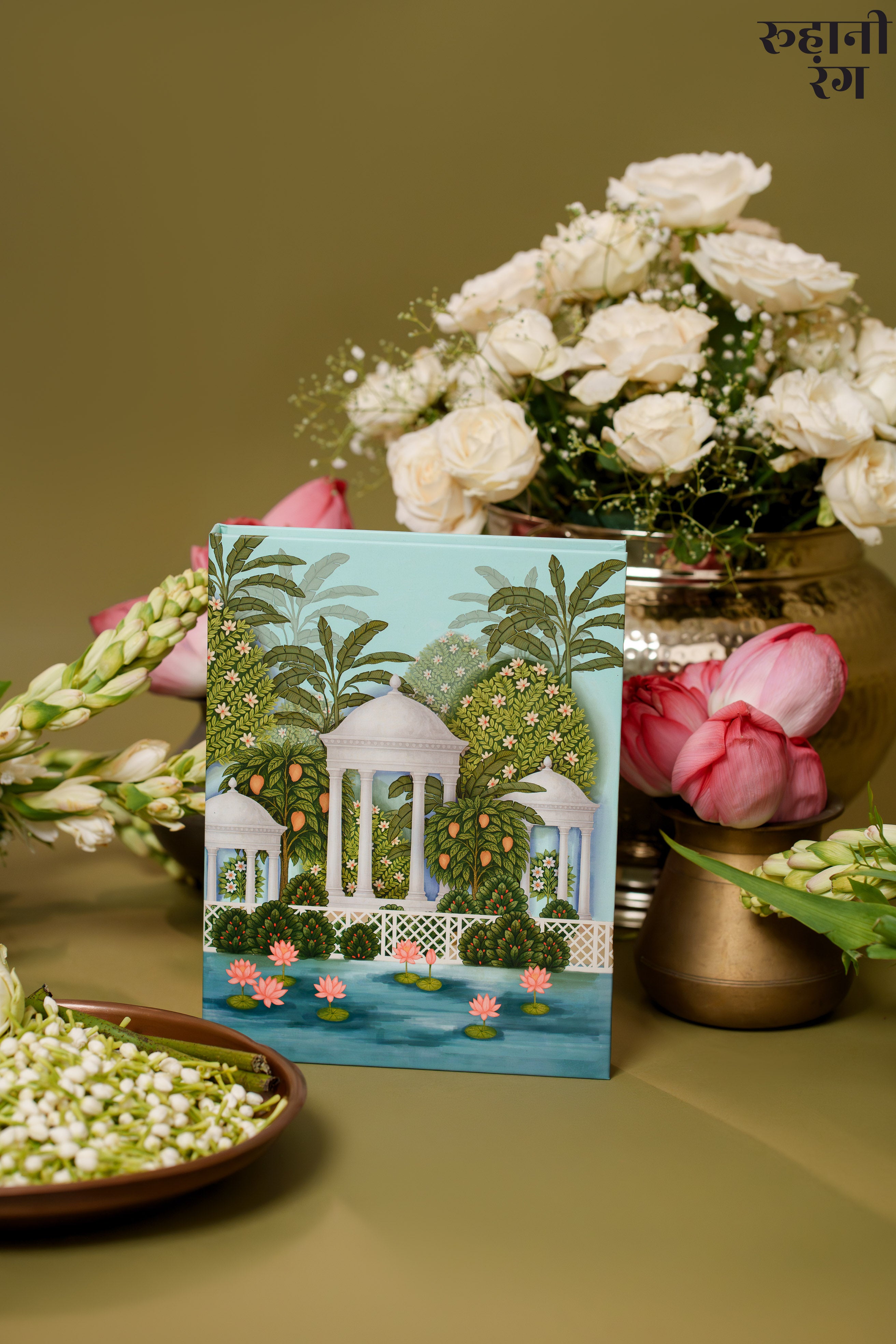 The cover art, Saanjh at Pichola , captures a serene evening at lake pichola - chatris, lotuses, and dense pichwai trees — hand-illustrated to honor India’s heritage of miniature paintings.